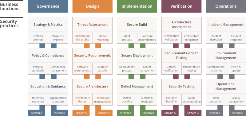 - Structure: It uses a rigid, symmetrical structure of 5 Business Functions (Governance, Design, Implementation, Verification, Operations), each containing 3 Security Practices.